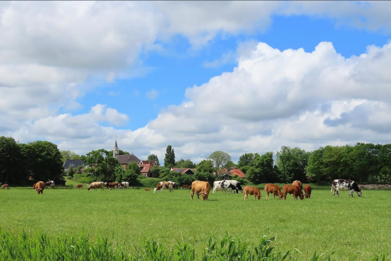 Een prachtig dorpsaanzicht met de koeien in de wei