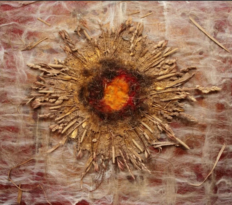 In haar collages verwerkt ze diezelfde grondstoffen, samen met ander materiaal uit de natuur, zoals bladeren, riet, bloemen, veren en schelpen. Daarnaast gebruikt ze ook wel foto’s, acrylverf en krijt. Naast collages, maakt ze ook kaarten.